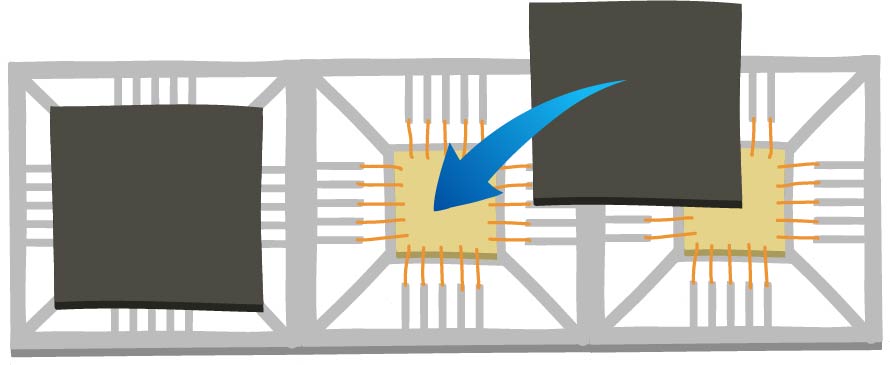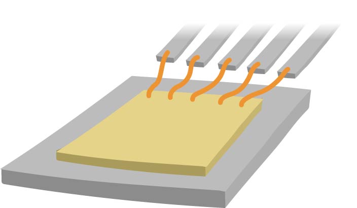| 3 | チップとリードフレームや基板・パッケージをボンディングワイヤーで電気的に接続し、低抵抗・高信頼でモールド等に耐える接合を形成します。 | ボール ボンディング |