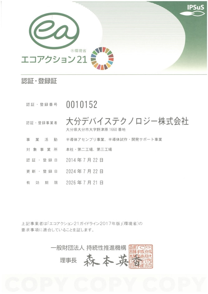 大分デバイステクノロジー株式会社は、「かけがえのない地球環境を、健全な状態で次世代に引き継いでいくことは、現存する人間の基本的責務」との認識に立って、豊かな価値の創造と地球との共生を図ります。低炭素社会、循環型社会、自然共生社会を目指した環境活動を認識し、全社一丸となって自主的・積極的に、環境負荷低減に努力します。